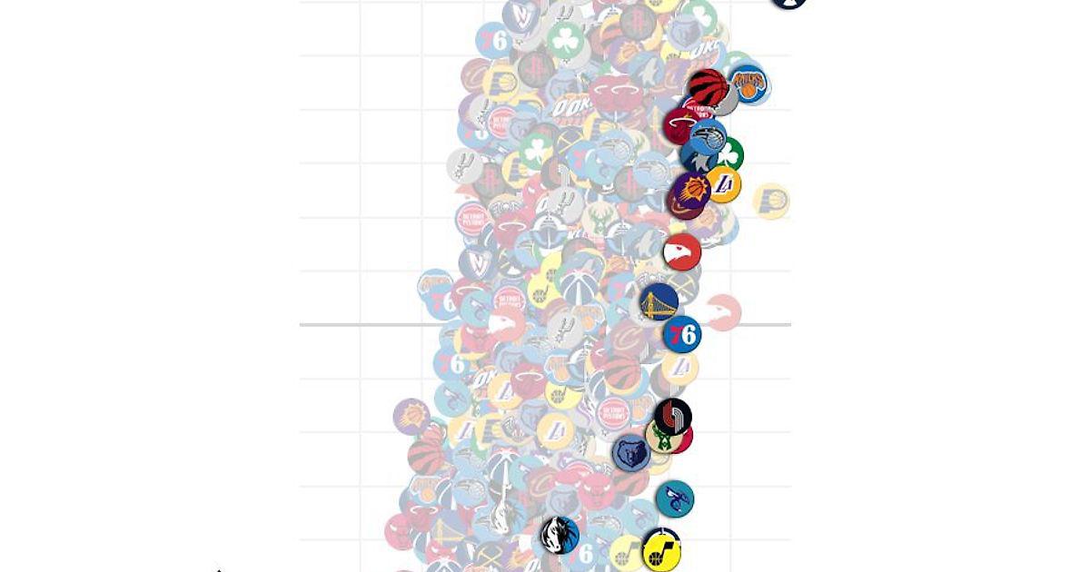 Аналитик Тодд Уайтхед представил текущие показатели разницы (net rating, ось y) клубов НБА после 20 игр в соотношении с их атакующим рейтингом (по оси x). Бледными обозначены прежние результаты команд с сезона-1983/84.