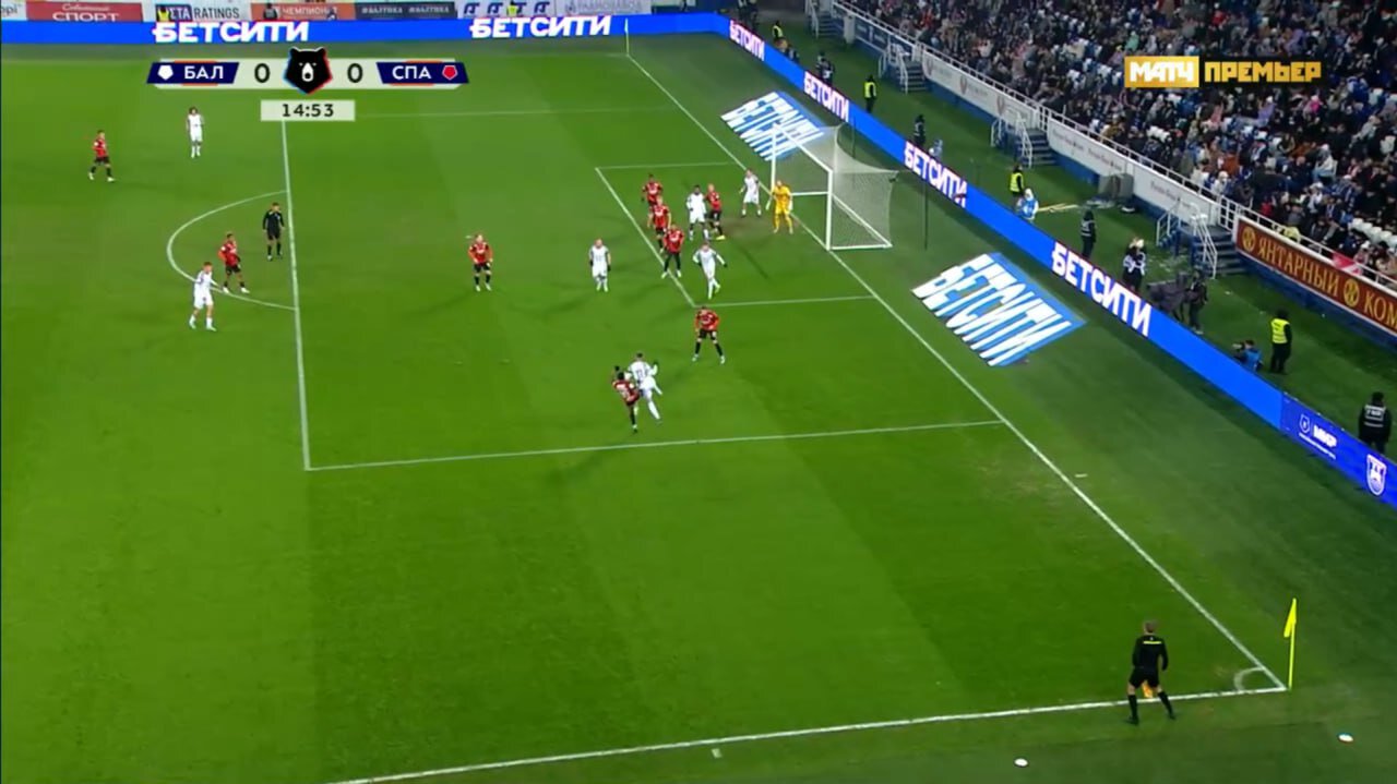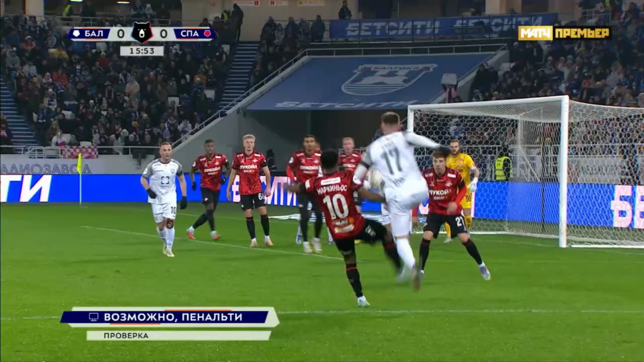 Хавбек клуба из Калининграда упал в штрафной площади соперника после возможного контакта с игроком красно-белых. Главный судья Кирилл Левников не назначил пенальти.