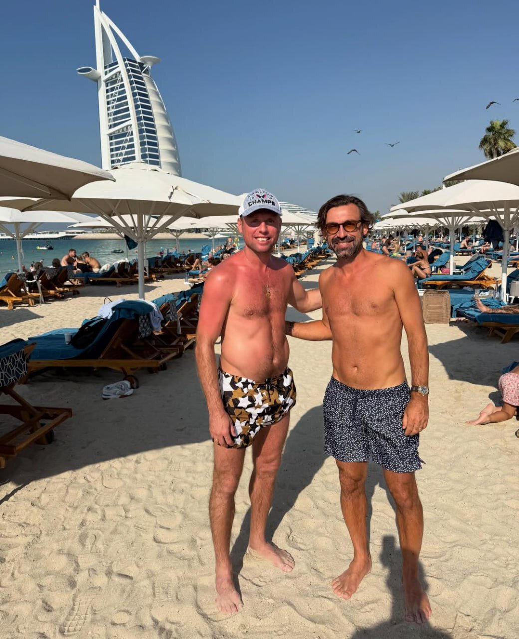 Денис Глушаков опубликовал в соцсетях фото с экс-полузащитником «Ювентуса» и «Милана» Андреа Пирло, сделанное на пляже в Дубае.