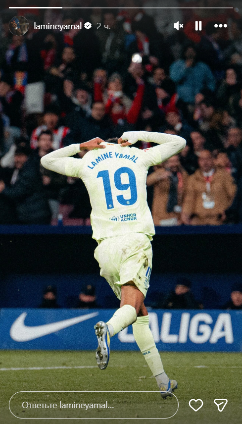 Ямаль поделился в сторис фотографией празднования своего гола в ворота «Атлетико» в марте 2025 года, когда «Барселона» одержала победу на выезде со счетом 4:2.