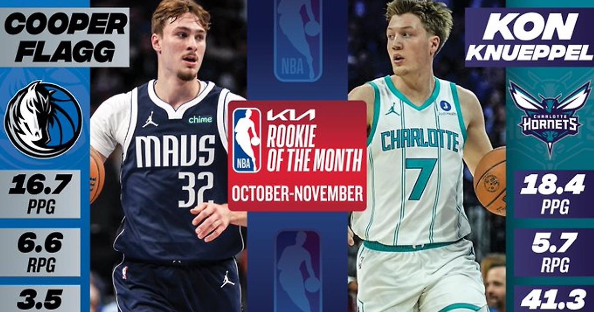 НБА назвала Купера Флэгга из «Далласа» и Кона Книппела из «Шарлотт» лучшими новичками октября и ноября в Западной и Восточной конференциях соответственно.