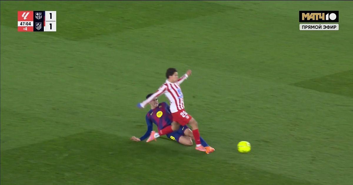 На 2-й добавленной к первому тайму минуте защитник Жерар Мартин, догоняя Джулиано Симеоне, попытался в подкате выбить у соперника мяч, но не успел и зацепил ногу соперника.