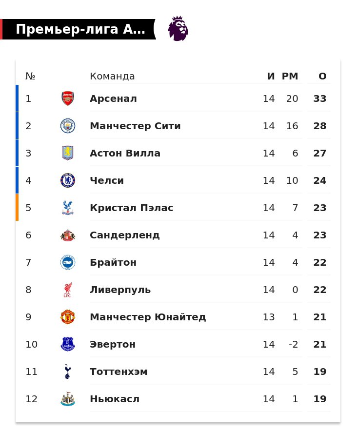 «Арсенал» лидирует в АПЛ после 14 туров. «Ман Сити» отстает на 5 очков, «Астон Вилла» – на 6, «Челси» – на 9, «Ливерпуль» – на 11, «МЮ» с игрой в запасе – на 12