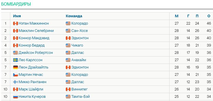 Лидирует в гонке форвард «Колорадо» Нэтан Маккиннон, сегодня оставшийся без очков в матче с «Айлендерс» (3:6). У 30-летнего игрока 46 (22+24) баллов в 27 играх.