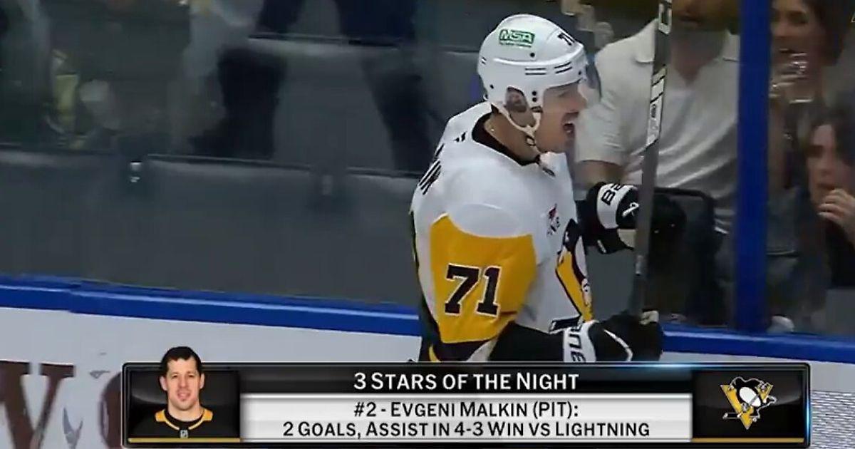 Вторая звезда – форвард «Питтсбурга» Евгений Малкин с 3 (2+1) очками в матче с «Тампой» (4:3). Он вышел на 26-е место в списке лучших бомбардиров в истории лиги.