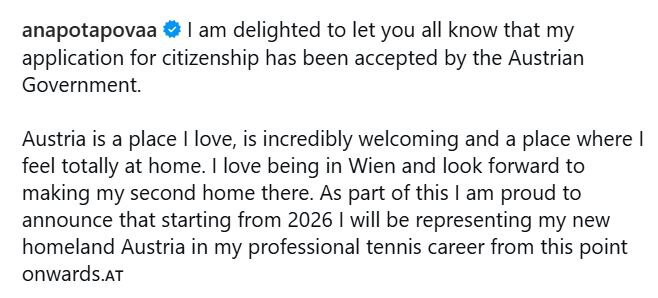 Потапова скопировала пост Касаткиной о смене гражданства, заменив Австралию на Австрию