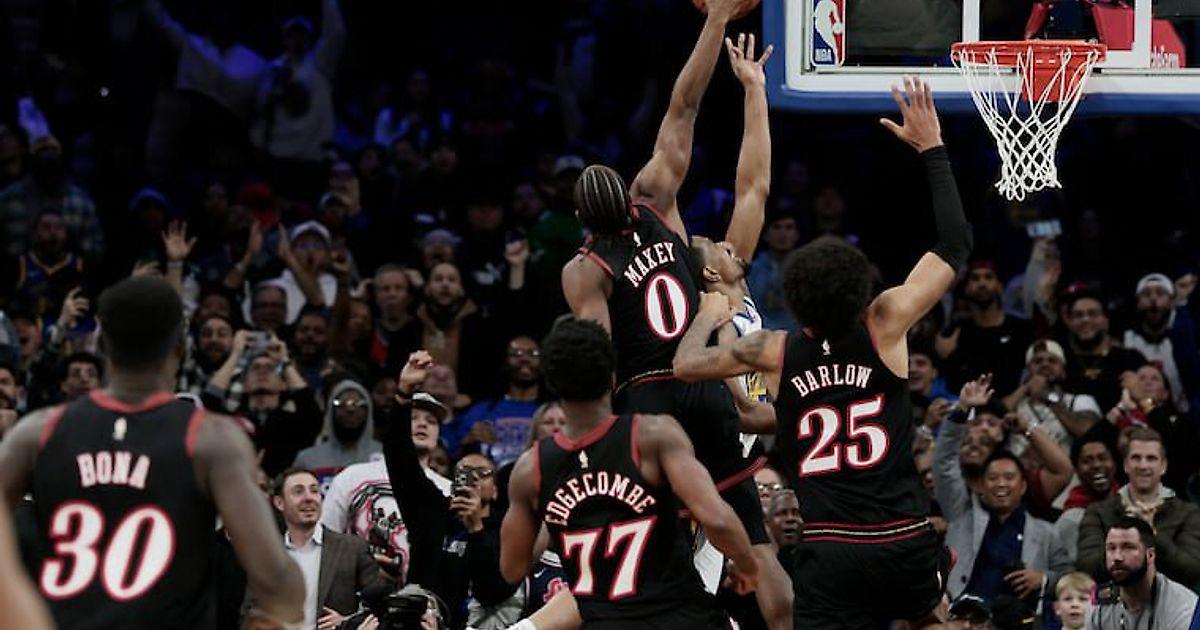Разыгрывающий Тайриз Макси принес «Филадельфии» победу над «Голден Стэйт», заблокировав лэй-ап Де’Энтони Мелтона перед сиреной.