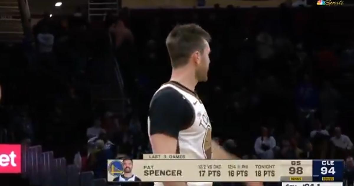 Защитник «Голден Стэйт» Пэт Спенсер помахал на прощание зрителям в Кливленде после ключевого попадания с линии на последних секундах.
