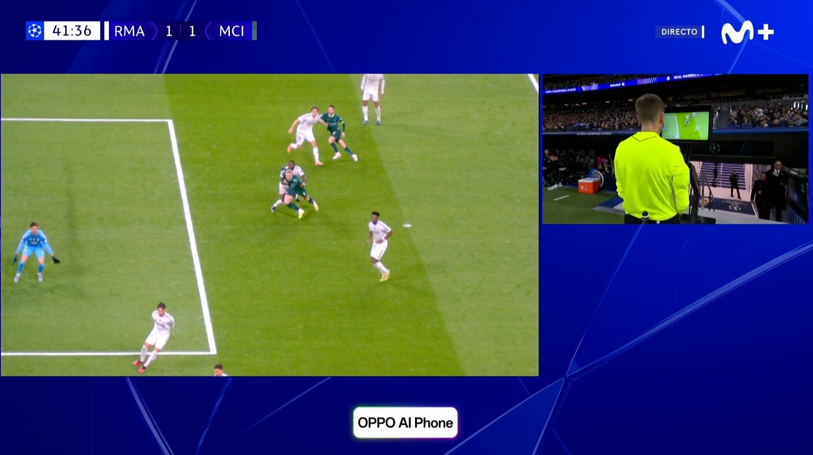 Игру на «Сантьяго Бернабеу» обслуживал французский арбитр Клеман Тюрпен. На 41-й минуте он назначил пенальти в ворота «Мадрида» за фол Антонио Рюдигера против Эрлинга Холанда. Вскоре в штрафной «Сити» после борьбы с Йошко Гвардиолом упал на газон защитник «сливочных» Рауль Асенсио – рефери не назначил пенальти.