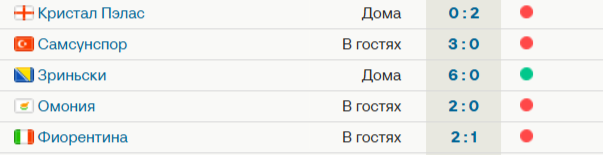 Украинская команда в гостях проиграла «Фиорентине» (1:2) в 5-м туре соревнования.