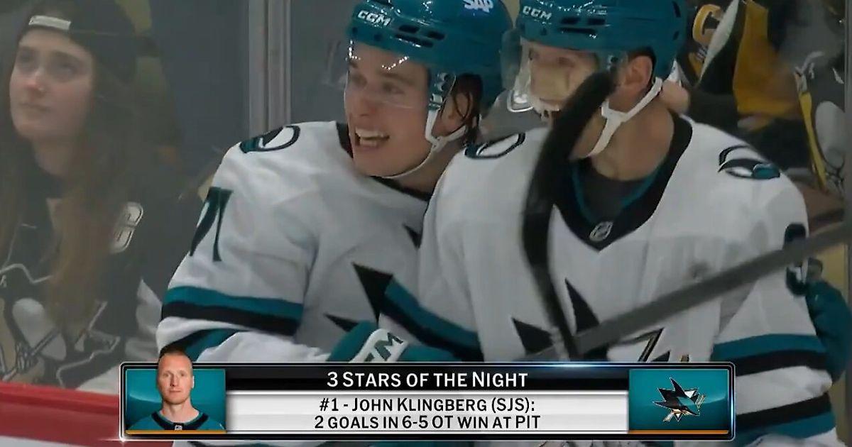 Первая звезда – защитник «Сан-Хосе» Джон Клингберг с дублем в ворота «Питтсбурга» (6:5 ОТ). Его гол в овертайме принес «Шаркс» первую в истории клуба победу при отыгранном дефиците в 4 шайбы в третьем периоде.