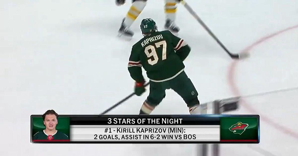 Кирилл Капризов с 2+1 в матче с «Бостоном» стал 1-й звездой дня в НХЛ.