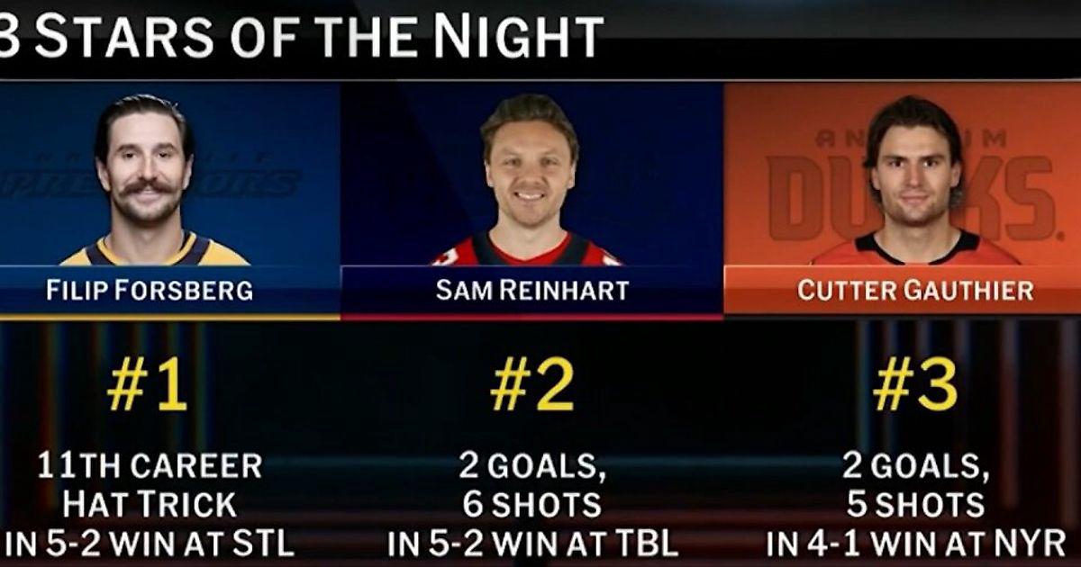 Первая звезда – форвард «Нэшвилла» Филип Форсберг с 3 шайбами в ворота «Сент-Луиса» (5:2). Он делит 2-е место с Матсом Нэслундом по числу хет-триков (11) среди шведов в истории лиги.