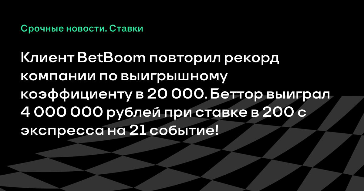 Клиент BetBoom повторил рекорд компании по выигрышному коэффициенту в 20 000. Беттор выиграл 4 000 000 рублей при ставке в 200 с экспресса на 21 событие!