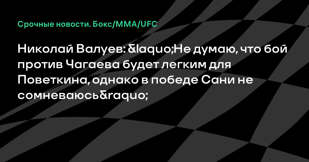 Экс-чемпион мира Николай Валуев поделился мнением о предстоящем 27 августа поединке за титул WBA в супертяжелом весе между Русланом Чагаевым и Александром Поветкиным.