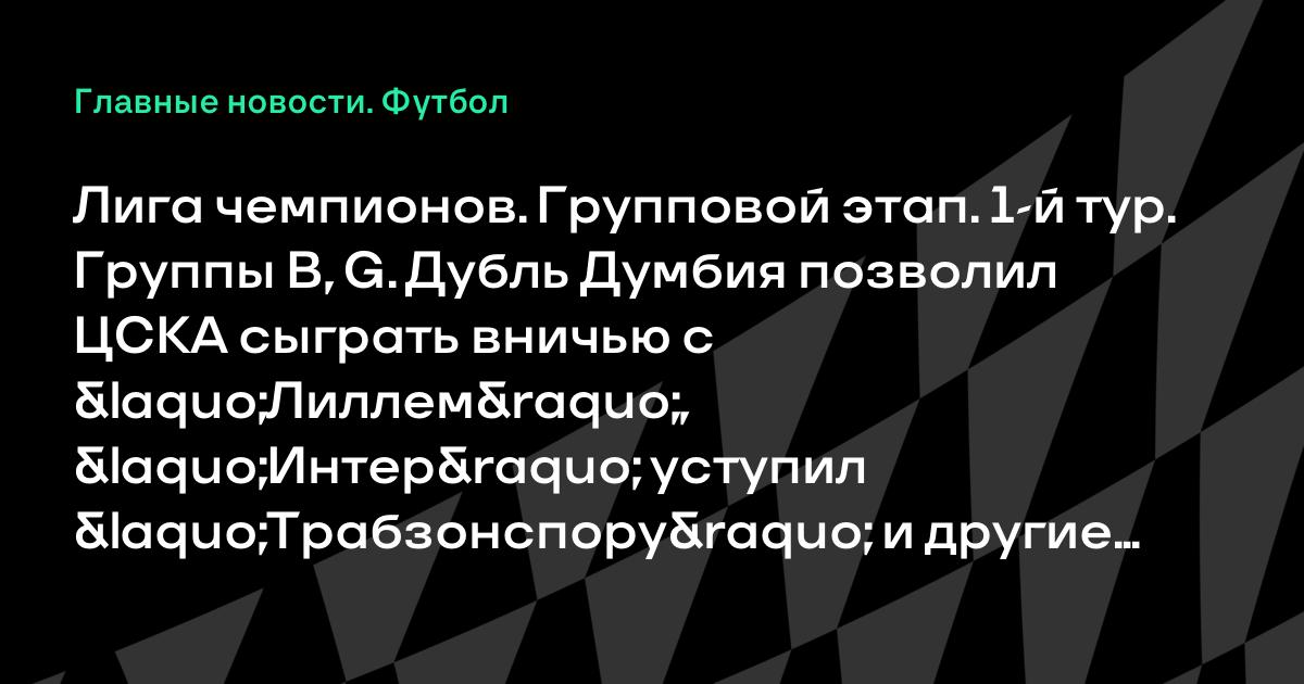Лига чемпионов. Групповой этап. 1-й тур. Группы B, G. Дубль Думбия позволил ЦСКА сыграть вничью с «Лиллем», «Интер» уступил «Трабзонспору» и другие результаты