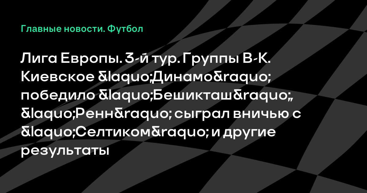 Лига Европы. 3-й тур. Группы В-К. Киевское «Динамо» победило «Бешикташ», «Ренн» сыграл вничью с «Селтиком» и другие результаты