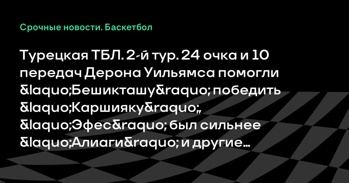 Турецкая ТБЛ. 2-й тур. 24 очка и 10 передач Дерона Уильямса помогли «Бешикташу» победить «Каршияку», «Эфес» был сильнее «Алиаги» и другие результаты