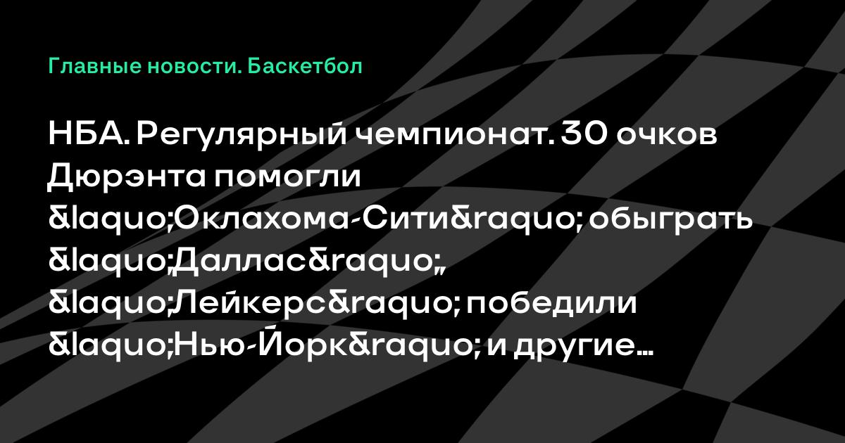 НБА. Регулярный чемпионат. 30 очков Дюрэнта помогли «Оклахома-Сити» обыграть «Даллас», «Лейкерс» победили «Нью-Йорк» и другие результаты
