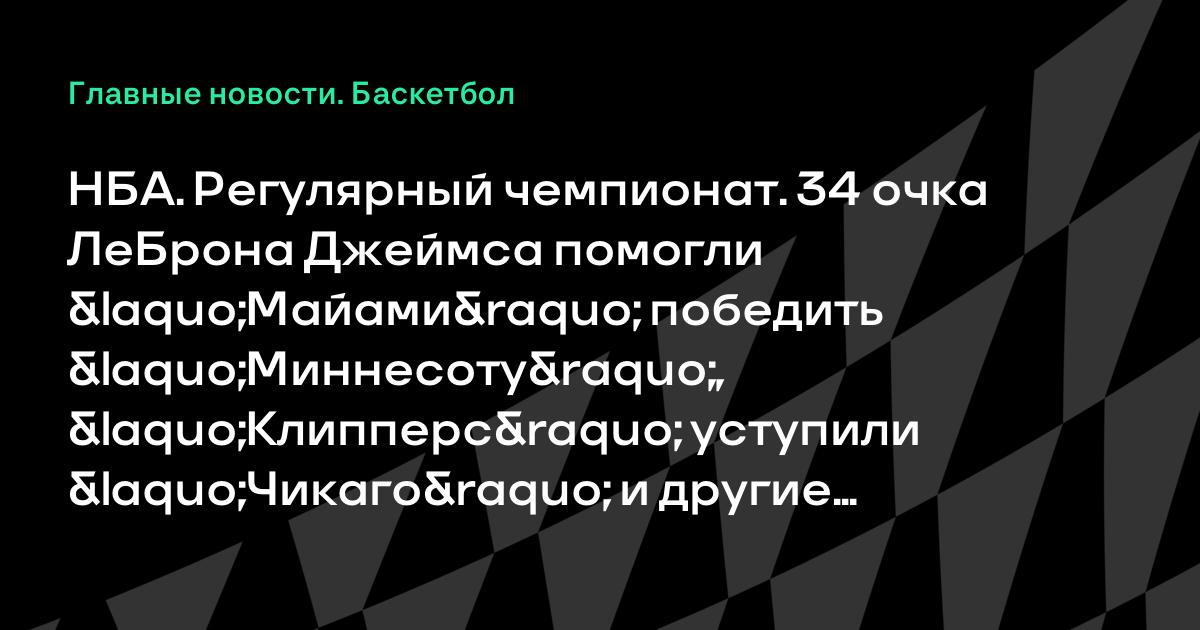 НБА. Регулярный чемпионат. 34 очка ЛеБрона Джеймса помогли «Майами» победить «Миннесоту», «Клипперс» уступили «Чикаго» и другие результаты