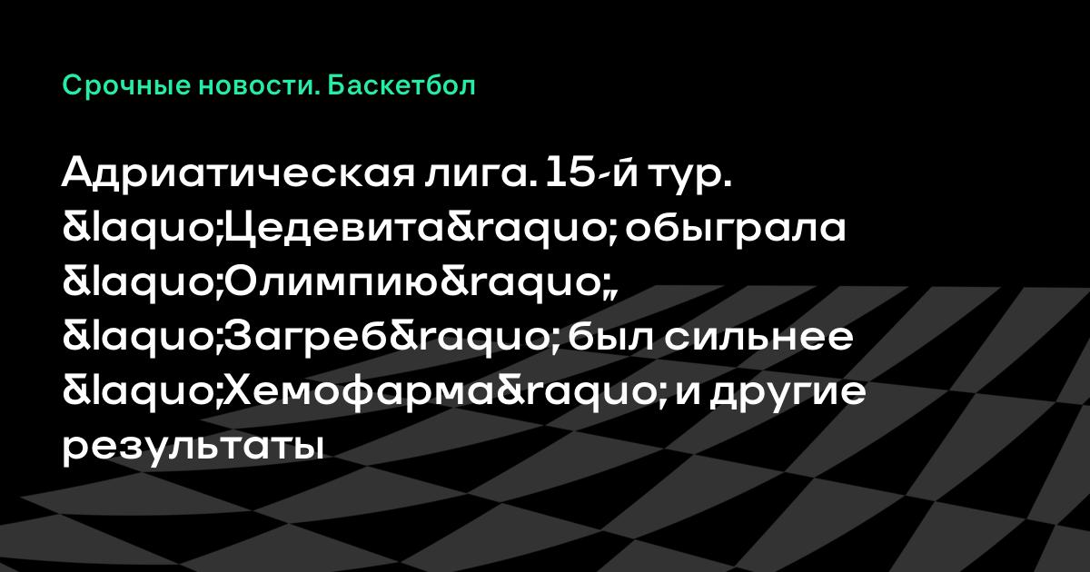 Адриатическая лига. 15-й тур. «Цедевита» обыграла «Олимпию», «Загреб» был сильнее «Хемофарма» и другие результаты