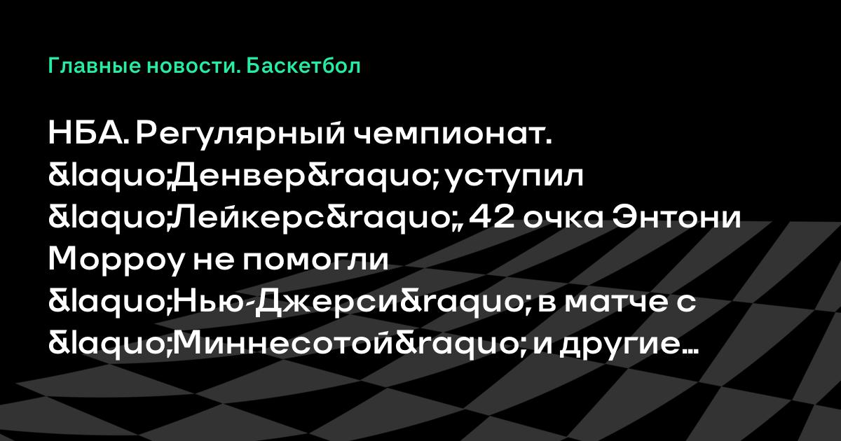 НБА. Регулярный чемпионат. «Денвер» уступил «Лейкерс», 42 очка Энтони Морроу не помогли «Нью-Джерси» в матче с «Миннесотой» и другие результаты