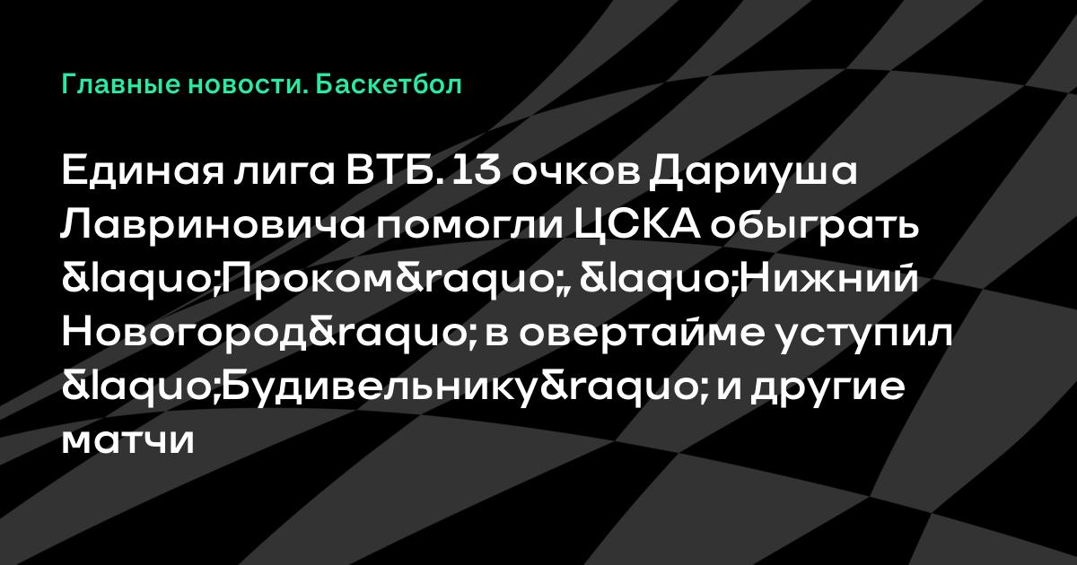 Единая лига ВТБ. 13 очков Дариуша Лавриновича помогли ЦСКА обыграть «Проком», «Нижний Новогород» в овертайме уступил «Будивельнику» и другие матчи