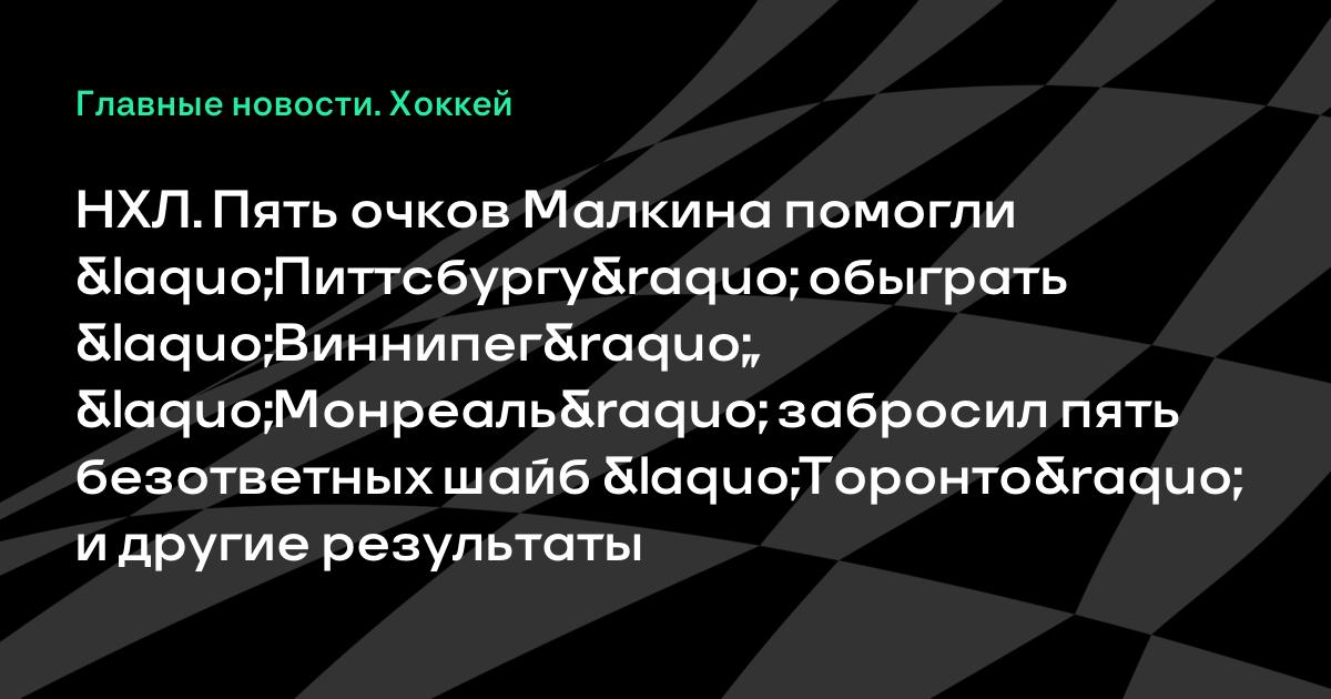 НХЛ. Пять очков Малкина помогли «Питтсбургу» обыграть «Виннипег», «Монреаль» забросил пять безответных шайб «Торонто» и другие результаты