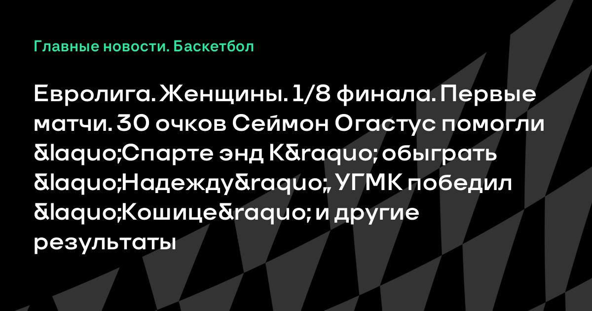 Евролига. Женщины. 1/8 финала. Первые матчи. 30 очков Сеймон Огастус помогли «Спарте энд К» обыграть «Надежду», УГМК победил «Кошице» и другие результаты