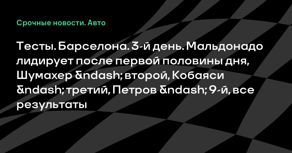 Тесты. Барселона. 3-й день. Мальдонадо лидирует после первой половины дня, Шумахер – второй, Кобаяси – третий, Петров – 9-й, все результаты