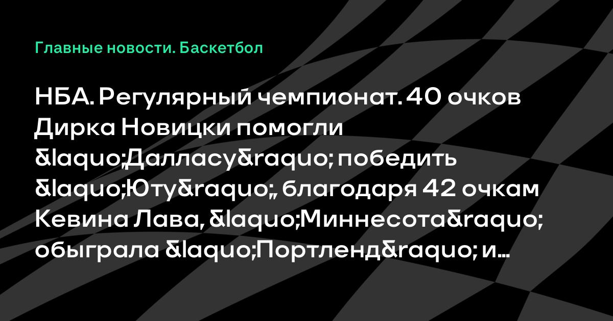 НБА. Регулярный чемпионат. 40 очков Дирка Новицки помогли «Далласу» победить «Юту», благодаря 42 очкам Кевина Лава, «Миннесота» обыграла «Портленд» и другие результаты