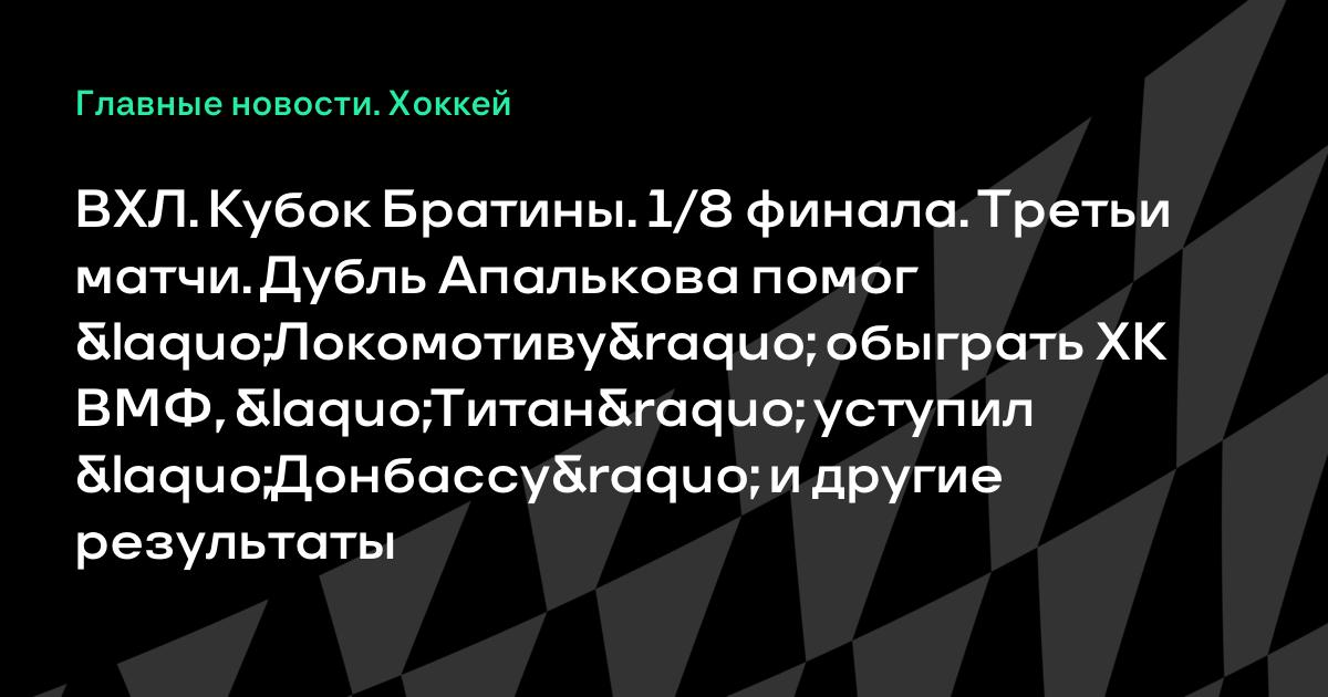 ВХЛ. Кубок Братины. 1/8 финала. Третьи матчи. Дубль Апалькова помог «Локомотиву» обыграть ХК ВМФ, «Титан» уступил «Донбассу» и другие результаты