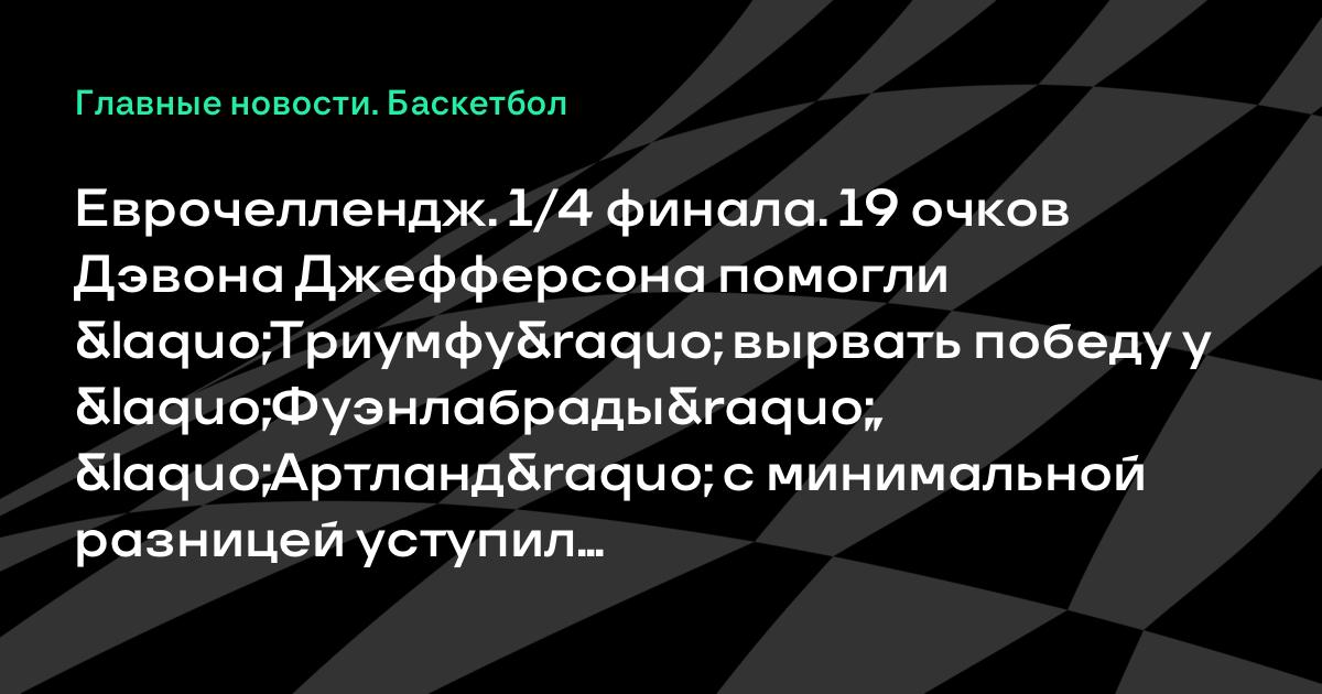 Еврочеллендж. 1/4 финала. 19 очков Дэвона Джефферсона помогли «Триумфу» вырвать победу у «Фуэнлабрады», «Артланд» с минимальной разницей уступил «Бешикташу» и другие результаты