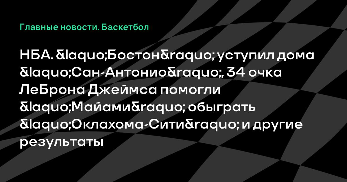 НБА. «Бостон» уступил дома «Сан-Антонио», 34 очка ЛеБрона Джеймса помогли «Майами» обыграть «Оклахома-Сити» и другие результаты