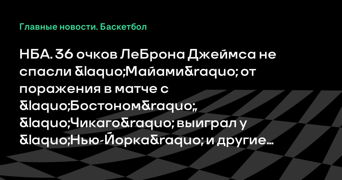 НБА. 36 очков ЛеБрона Джеймса не спасли «Майами» от поражения в матче с «Бостоном», «Чикаго» выиграл у «Нью-Йорка» и другие результаты