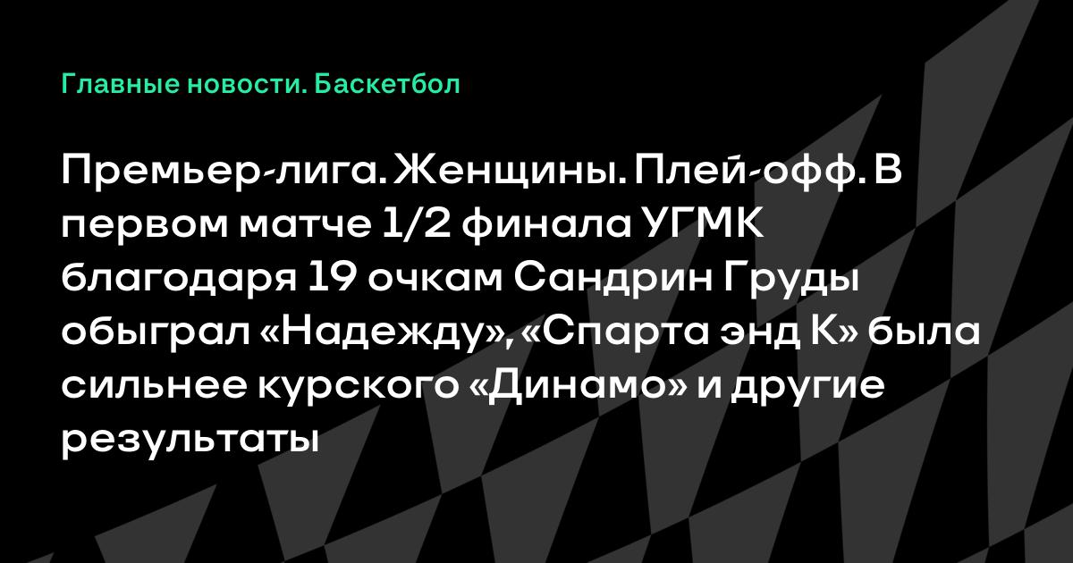 Премьер-лига. Женщины. Плей-офф. В первом матче 1/2 финала УГМК благодаря 19 очкам Сандрин Груды обыграл «Надежду», «Спарта энд К» была сильнее курского «Динамо» и другие результаты
