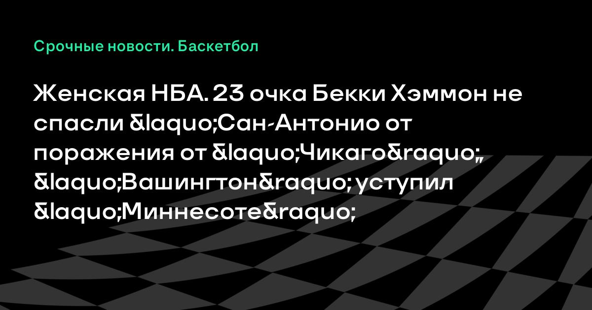 Несмотря на 23 очка Бекки Хэммон, «Сан-Антонио» уступил дома «Чикаго» в рамках регулярного чемпионата женской НБА. В другом сегодняшнем матче «Миннесота» обыграла на выезде «Вашингтон».