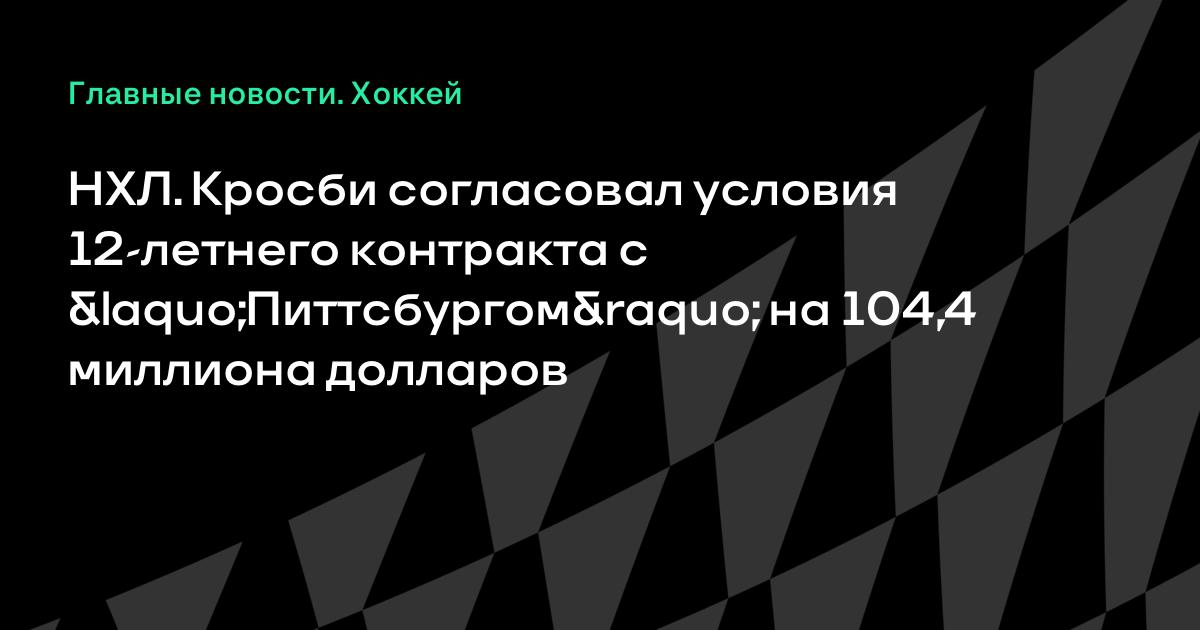 Нападающий «Питтсбурга» Сидни Кросби согласовал условия нового контракта с клубом. Как сообщил агент хоккеиста Пэт Бриссон, соглашение заключено на 12 лет и составляет 104,4 миллиона долларов, передает CAA Sports.