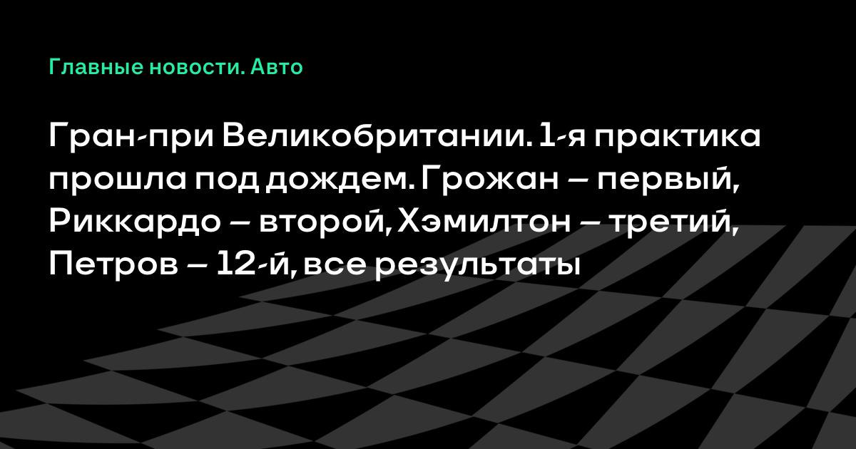 Гран-при Великобритании. 1-я практика прошла под дождем. Грожан – первый, Риккардо – второй, Хэмилтон – третий, Петров – 12-й, все результаты