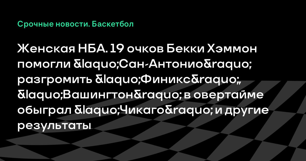 Женская НБА. 19 очков Бекки Хэммон помогли «Сан-Антонио» разгромить «Финикс», «Вашингтон» в овертайме обыграл «Чикаго» и другие результаты