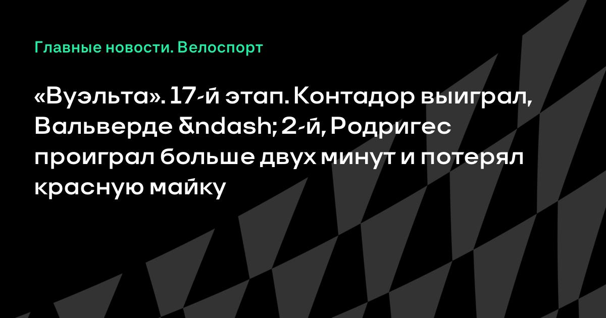 Сегодня прошел 17-й этап веломногодневки «Вуэльта». Победу одержал испанский велогонщик Альберто Контадор, который участвовал в отрыве и финишировал в одиночестве с минимальным преимущество над своими преследователями. Гонщик «Катюши» Хоаким Родригес проиграл больше двух с половиной минут и опустился на третье место в общем зачете.