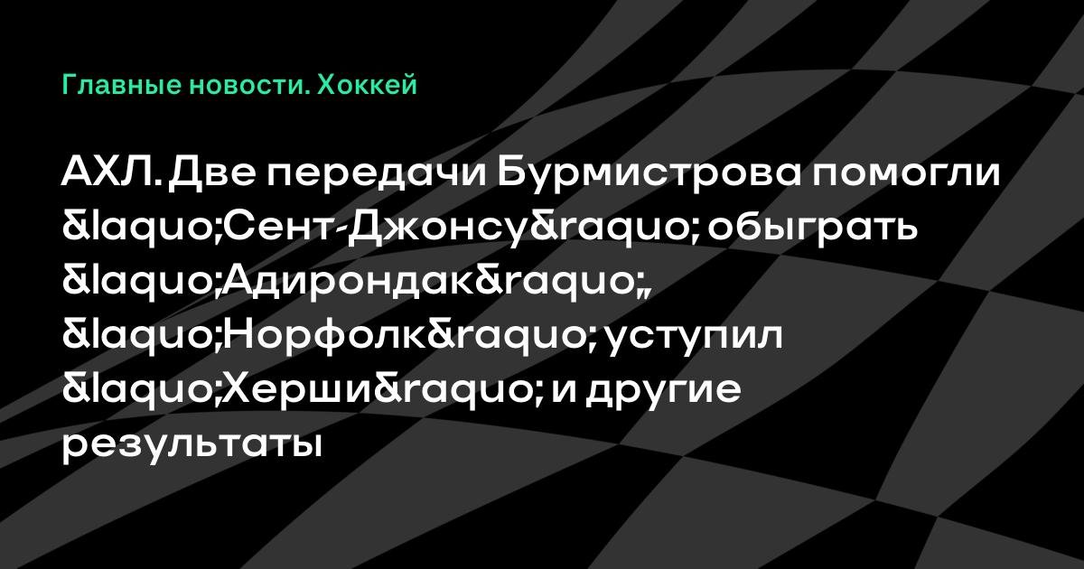 АХЛ. Две передачи Бурмистрова помогли «Сент-Джонсу» обыграть «Адирондак», «Норфолк» уступил «Херши» и другие результаты