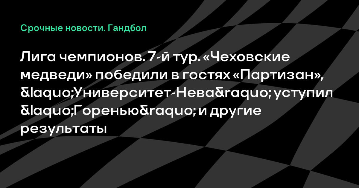 В мужской гандбольной Лиге чемпионов прошел седьмой тур группового этапа. «Чеховские медведи» победили в гостях сербский «Партизан» (31:27), а «Университет-Нева» дома уступил словенскому «Горенью» (25:32).