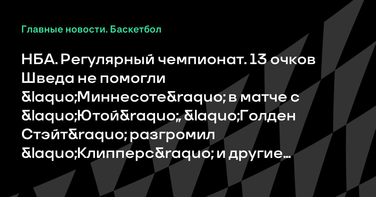 НБА. Регулярный чемпионат. 13 очков Шведа не помогли «Миннесоте» в матче с «Ютой», «Голден Стэйт» разгромил «Клипперс» и другие результаты