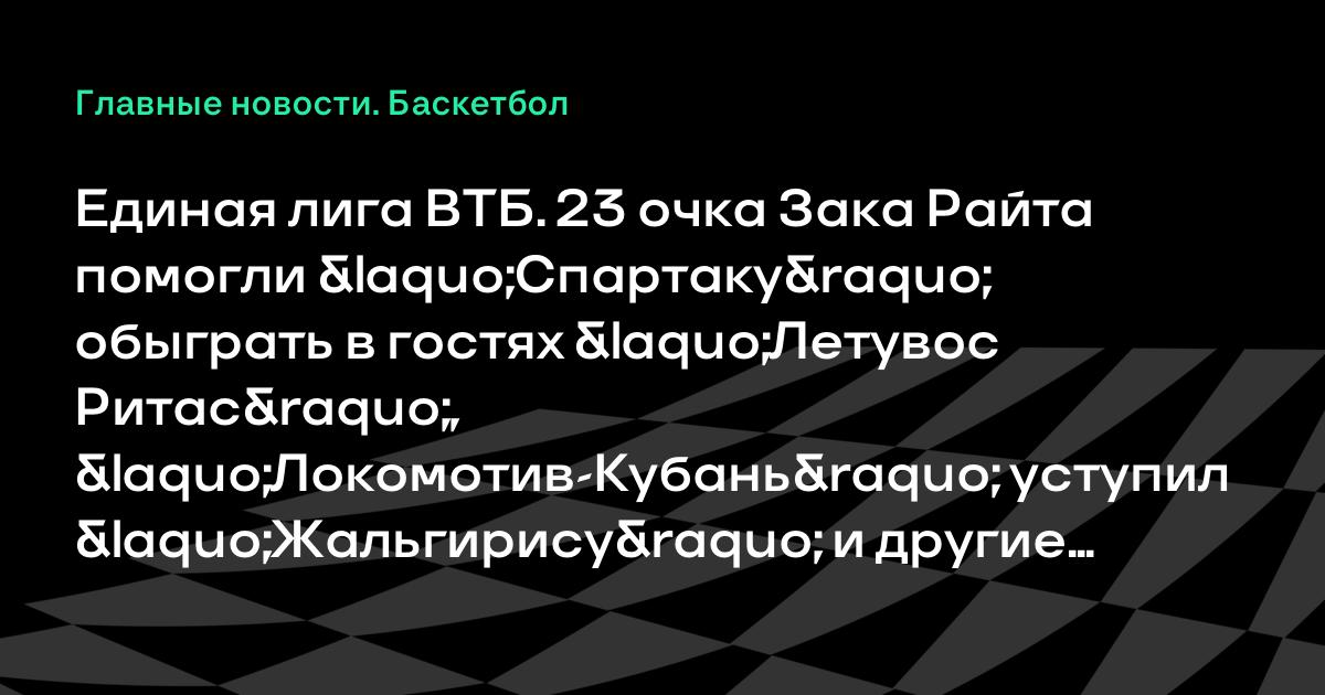 Единая лига ВТБ. 23 очка Зака Райта помогли «Спартаку» обыграть в гостях «Летувос Ритас», «Локомотив-Кубань» уступил «Жальгирису» и другие результаты