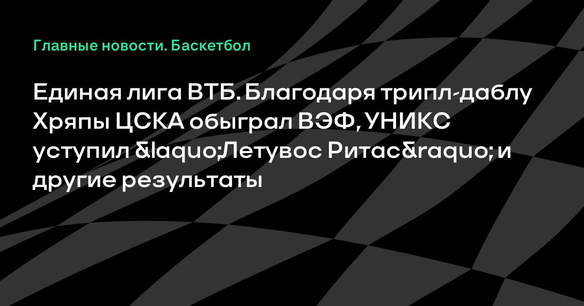 Единая лига ВТБ. Благодаря трипл-даблу Хряпы ЦСКА обыграл ВЭФ, УНИКС уступил «Летувос Ритас» и другие результаты
