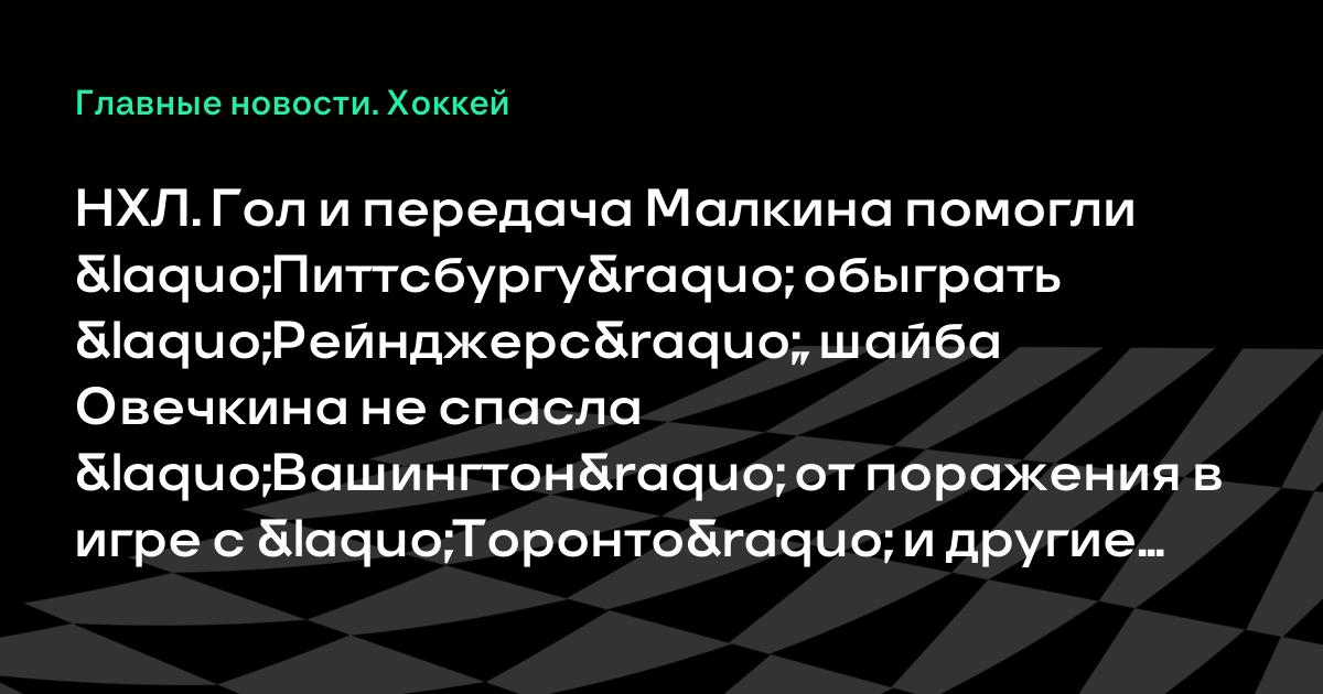 НХЛ. Гол и передача Малкина помогли «Питтсбургу» обыграть «Рейнджерс», шайба Овечкина не спасла «Вашингтон» от поражения в игре с «Торонто» и другие результаты
