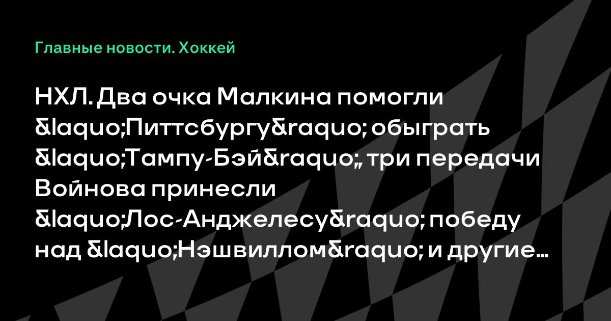 НХЛ. Два очка Малкина помогли «Питтсбургу» обыграть «Тампу-Бэй», три передачи Войнова принесли «Лос-Анджелесу» победу над «Нэшвиллом» и другие результаты