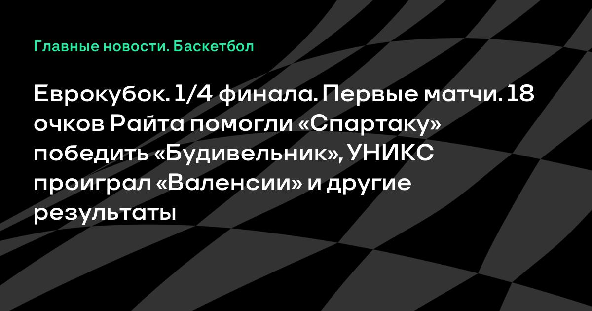 Еврокубок. 1/4 финала. Первые матчи. 18 очков Райта помогли «Спартаку» победить «Будивельник», УНИКС проиграл «Валенсии» и другие результаты