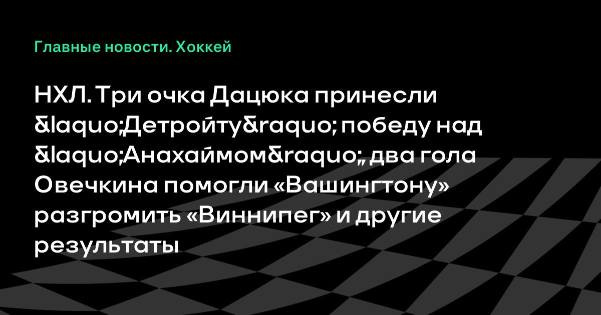 НХЛ. Три очка Дацюка принесли «Детройту» победу над «Анахаймом», два гола Овечкина помогли «Вашингтону» разгромить «Виннипег» и другие результаты